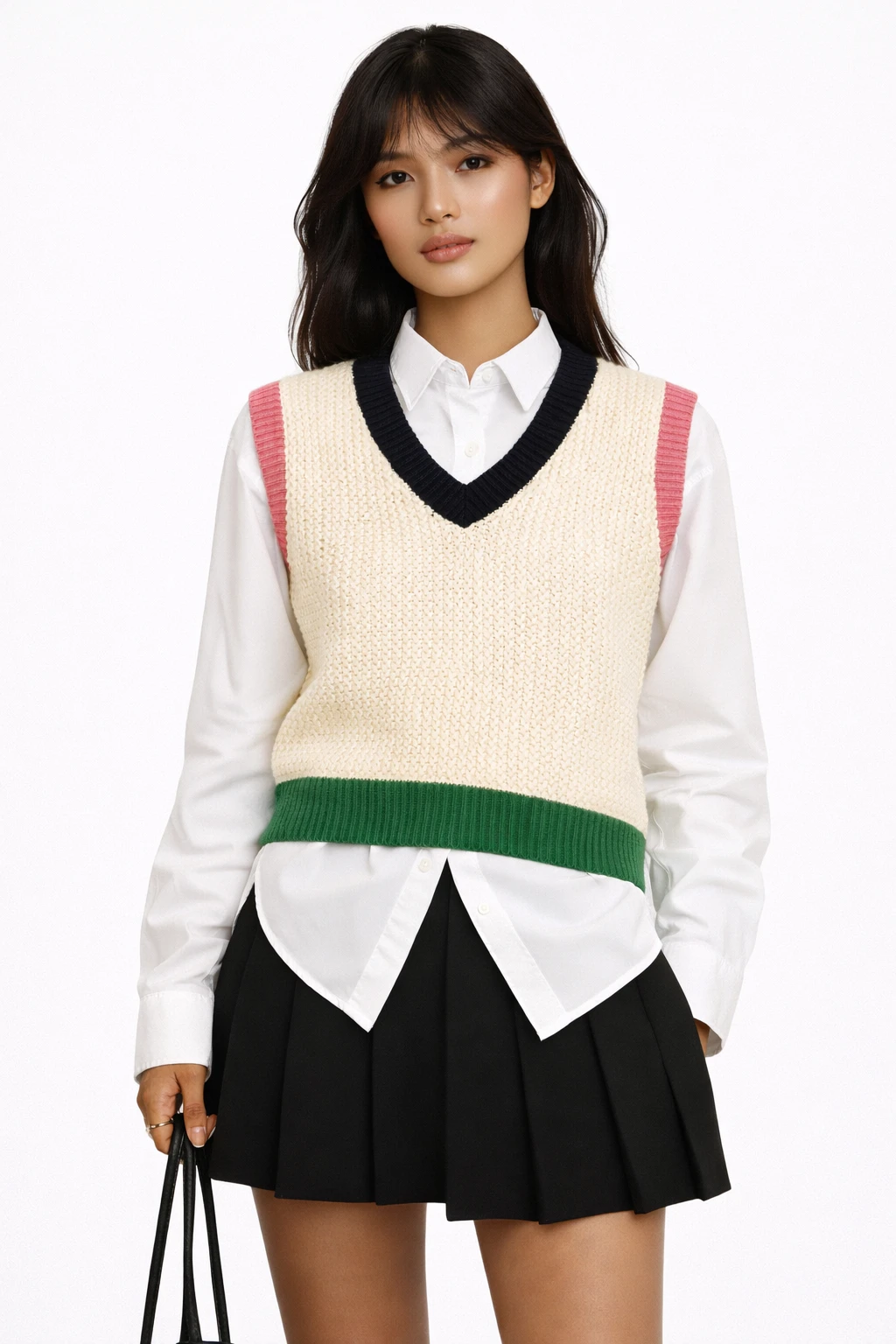 The Aunovelle Colorblock V-Neck Sweater Vest is a stylish and versatile piece that combines comfort with modern design. Featuring a classic V-neckline and sleeveless design, this sweater vest is perfect for layering or wearing on its own. The textured knit body and contrast ribbed trim offer a unique, elevated look, while the colorblock detailing adds a trendy touch. Its cropped length provides a flattering silhouette, making it an ideal addition to your wardrobe for both casual and chic outfits.