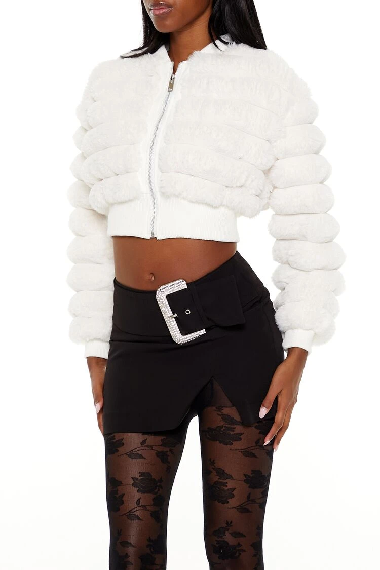 - Design: Faux fur bomber jacket with ribbed trim, quilted stitching, flat collar, and zip-up front closure