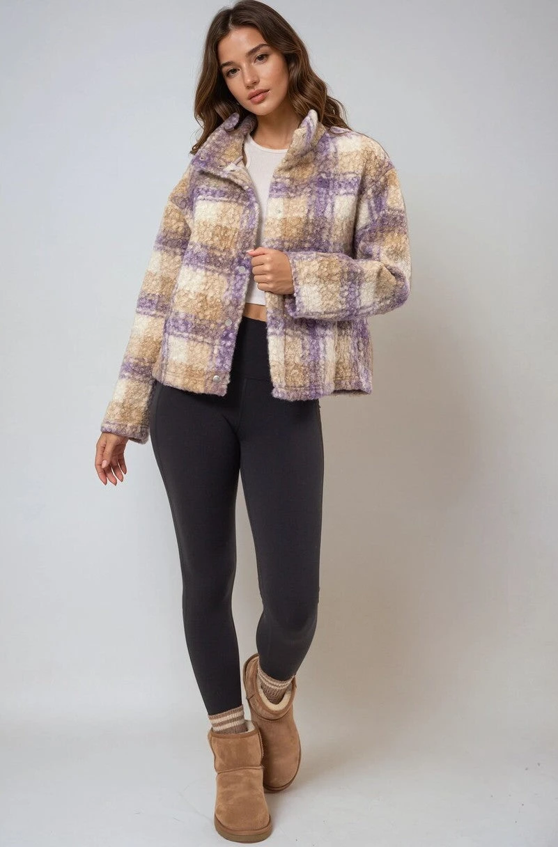 - Design: Boucle fabric with classic plaid pattern, button-front closures, long sleeves, and structured collar