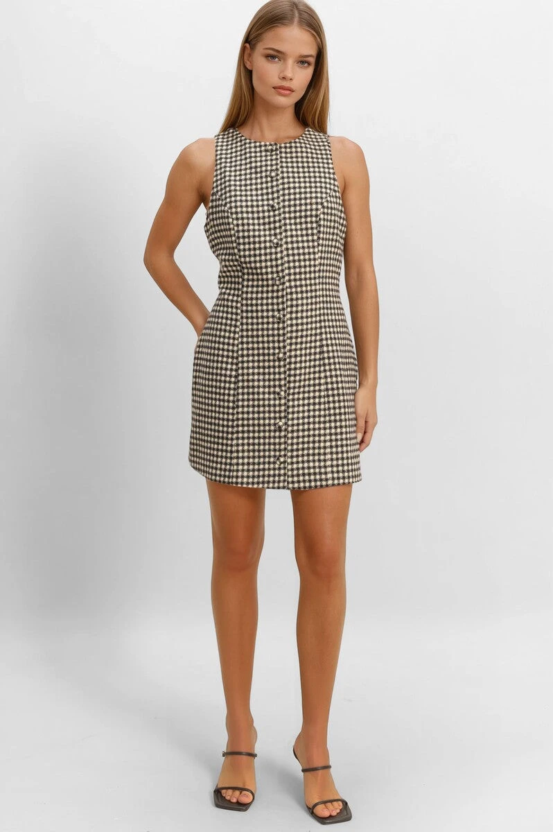 The Aunovelle mini dress is a chic and polished piece that brings timeless style to your wardrobe. Featuring a classic houndstooth pattern, this dress offers a sophisticated, versatile look. The sleeveless design and button-front closures add a modern touch, while the round neckline and shift silhouette provide a relaxed yet flattering fit, making it perfect for both casual and semi-formal occasions.